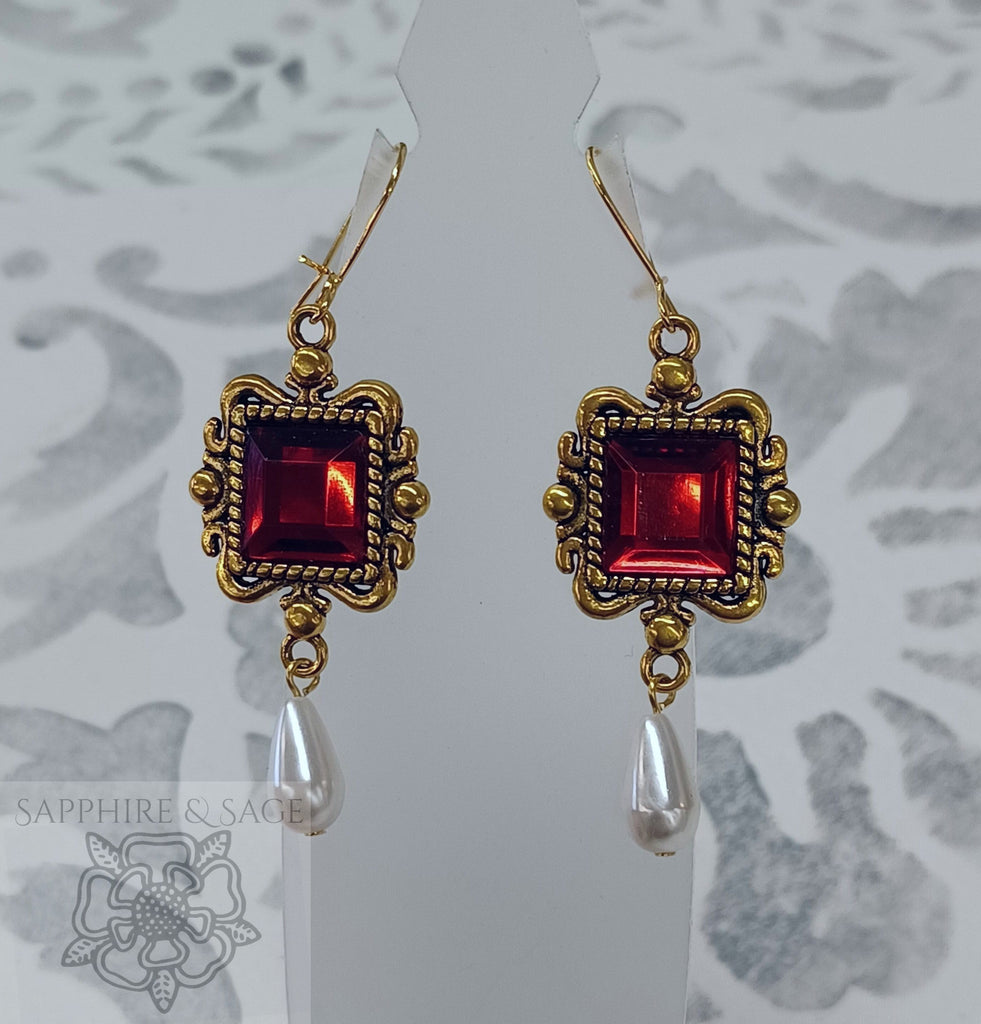 Add a touch of classic elegance to your look with our "Erynne" Renaissance Earrings. Featuring 12mm richly colored stones in square embellished settings, these earrings are perfect for any costume or formal occasion.